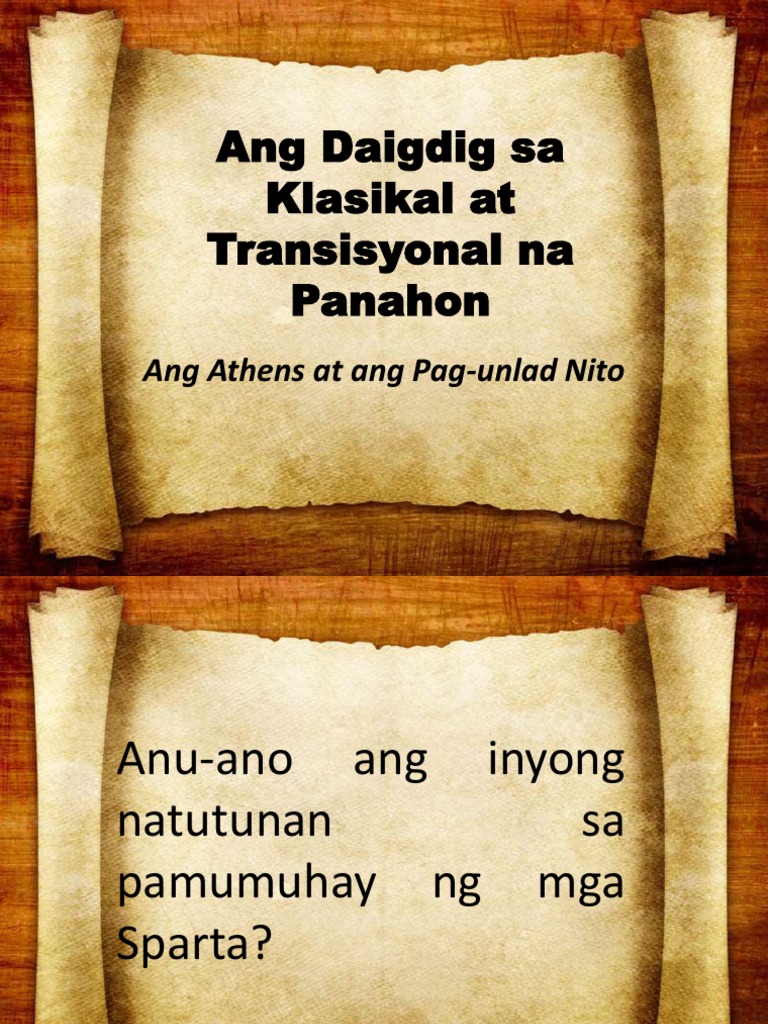 Asked By Wiki User. Mga Gabay na Tanong. Naipapahayag ang pagpapahalaga sa sibilisasyong Athens at Sparta.