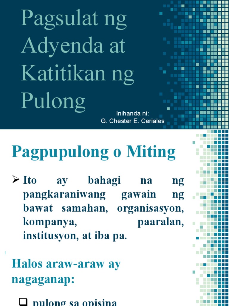 Isinusulat dito ang tinatalakay sa pagpupulong ng bahagi ng adyenda. Bakit mahalaga ang pulong sa pag-iral ng isang organsisasyon o samahan.