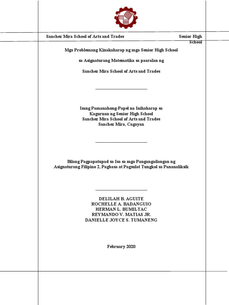 Naglalayong masagot ang mga pangunahing. March 31 2017. Matukoy ang mga dahilan kung bakit nahihirapan at bumabagsak sa asignaturang Matematika ang mga estudyante.
