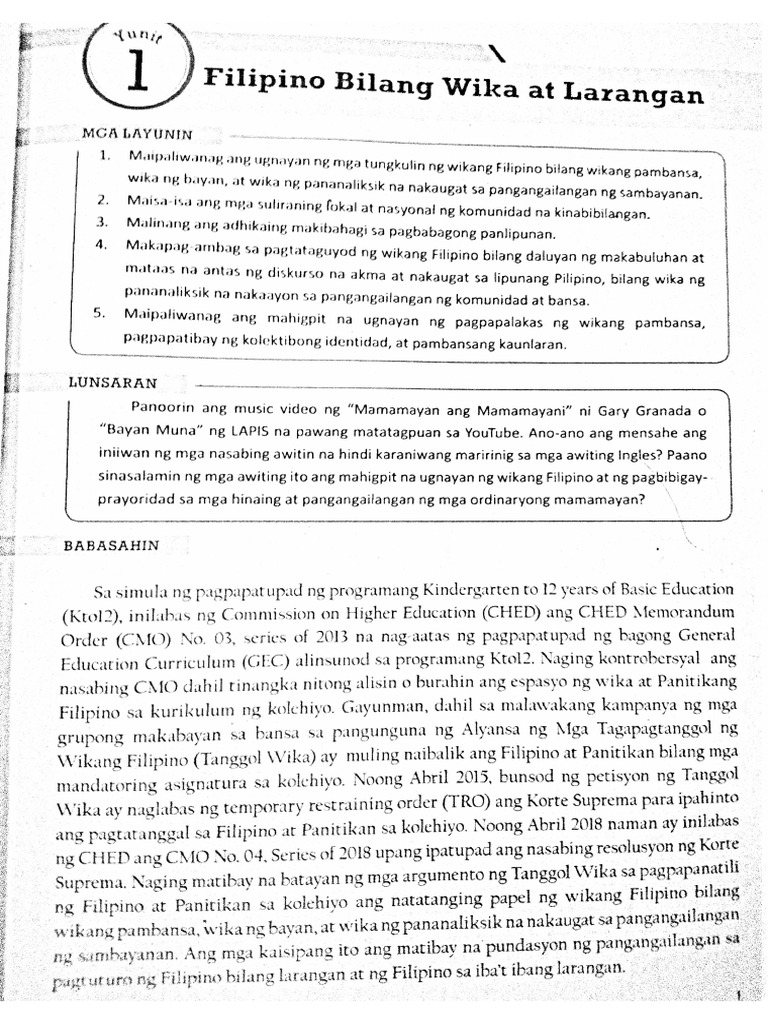 Ang Wikang Filipino ay sumisimbolo sa kultura ng mga Pilipino kung sino ano at meron sila. Ang wikang Filipino ay likas sa bawat Pilipino kaya naman kung magkakaunawaan ang bawat isa gamit ang wikang ito ay hindi malabong makamtan natin ang ating mga adhikain bilang isang bansaSa pamamagitan ng wika magkakaroon ng tulay ang bansang Pilipinas. 1 MODYUL 8 PAGSIBOL NG KAMALAYANG PILIPINO Ang Pilipino ay likas na mapagtiis at mapagbigay kung kayat ang mga pagmamalabis at pang-aabuso ng mga Espanyol sa kanilang karapatan ay tiniis nila sa mahabang panahon.