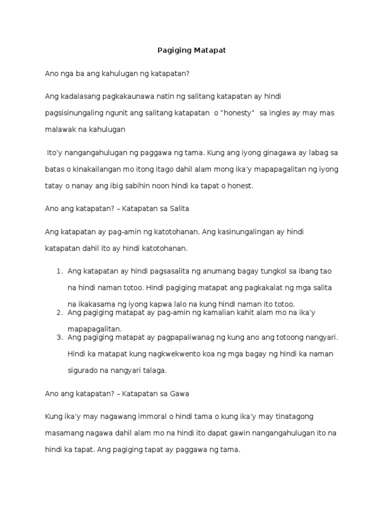 Bakit mahalagang isabuhay ang katapatan sa salita at gawa. Isa ang pagiging matapat sa mga kaugaliang makapagbibigay ng mapayapang buhay sa marami sa atin. Ang kilos na maaaring tama o mali6.