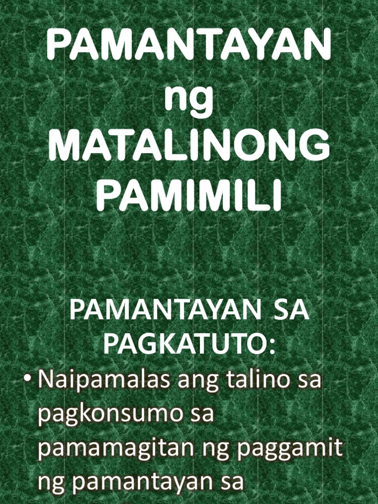 MGA PAMANTAYAN SA PAMIMILI. Ano ang mga katangian ng isang matalinong mamimili. 2 on a question 1.