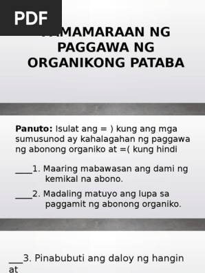 Bakit mahalaga ang paggamit ng abonong organiko sa paghahalaman. Makatitipid sa gastos ang mga. 2 on a question. Magastos kagaya ng komersyal na pataba d.